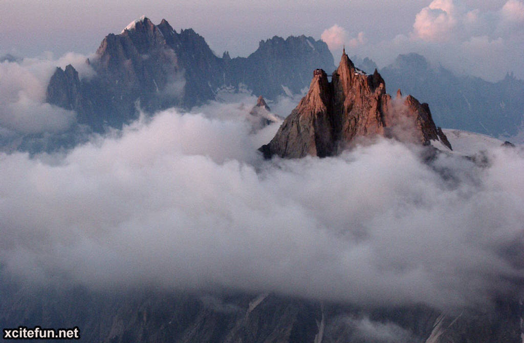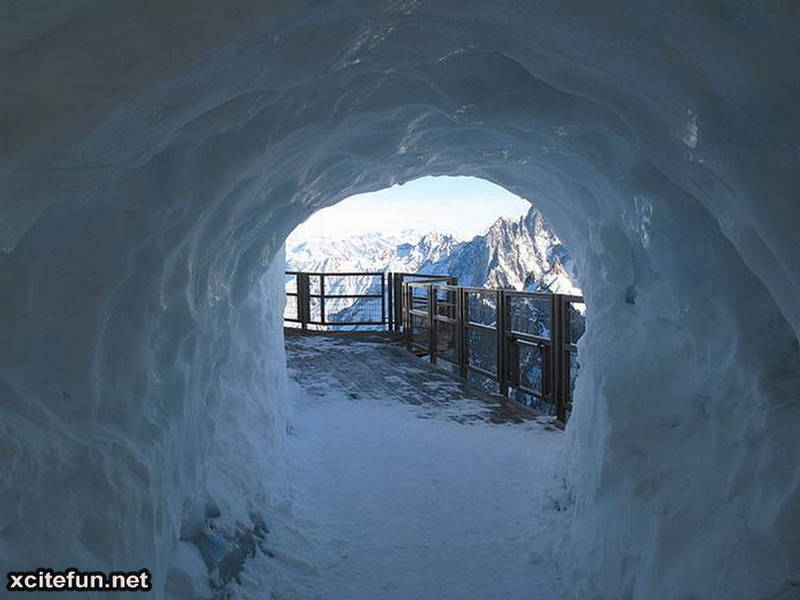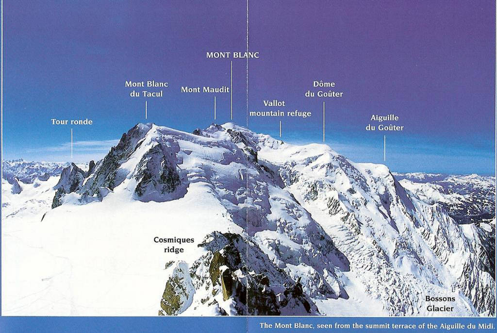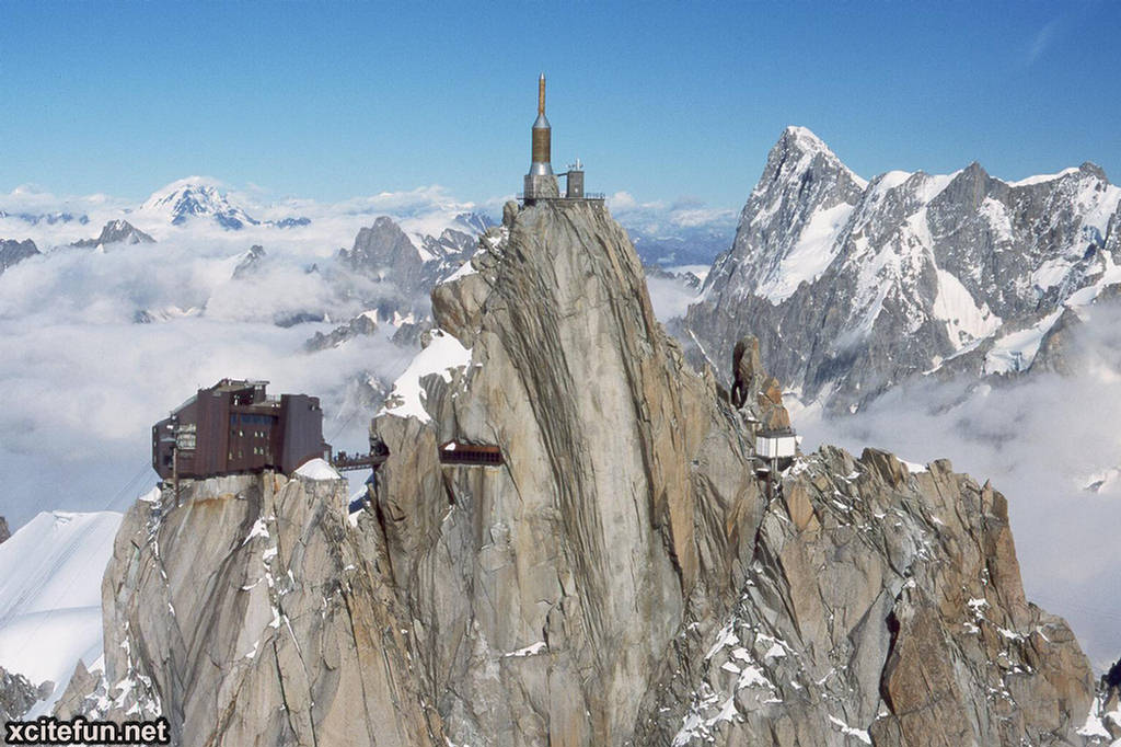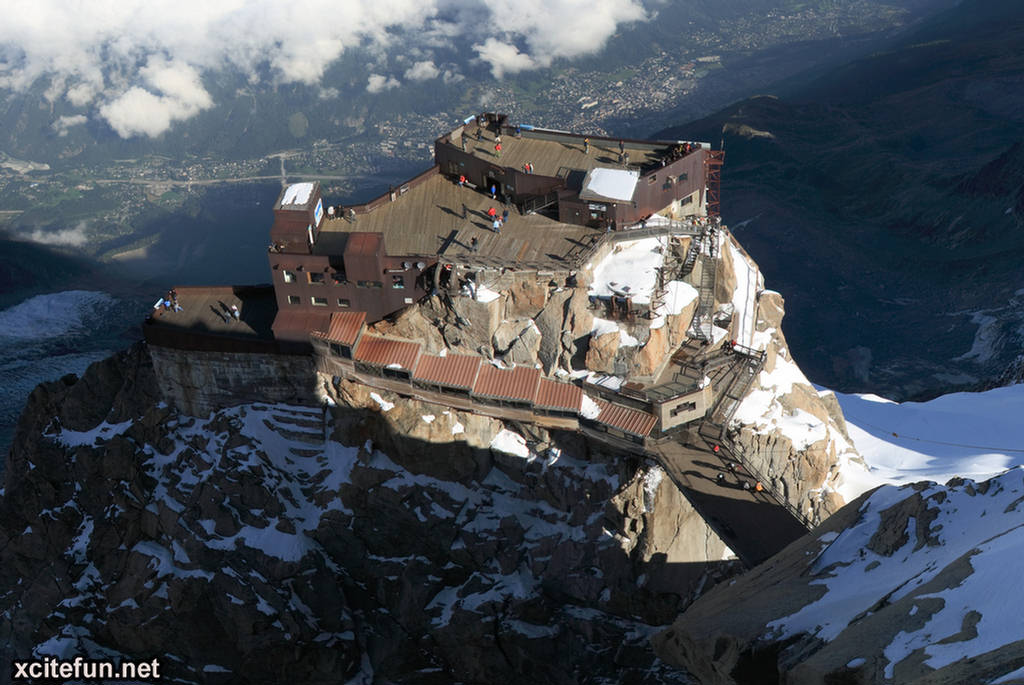 The Aiguille du Midi is a mountain in the Mont Blanc Massif in the French Alps. The name "Aiguille du Midi" translates literally as "needle of midday". It is so called as the sun sits directly over the peak at noon, when viewed from Chamonix. The Aiguille summit contains a panoramic viewing platform, a cafe and a gift shop.