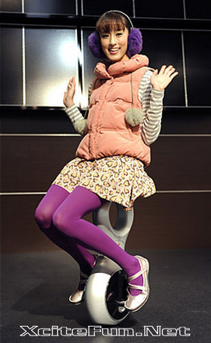A model shows off Honda Motor's experimental concept vehicle, the balance-control U3-X, at the Tokyo Motor Show. The vehicle can go forward, backward, side-to-side and diagonally, all of it controlled with a simple lean. Still in the experimental stage, the U3-X has a battery life of only 1 hour.