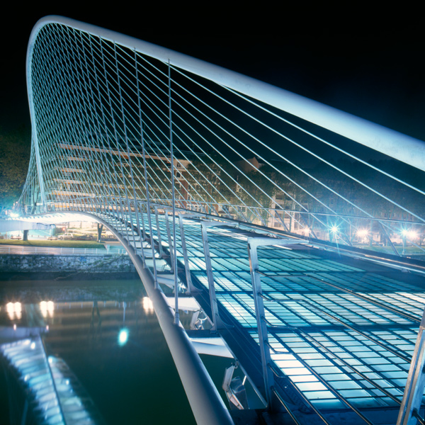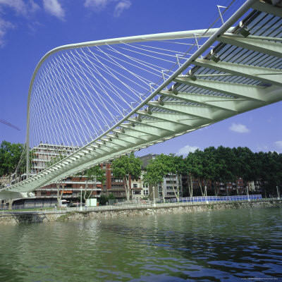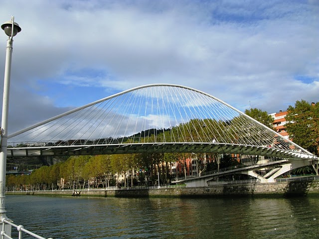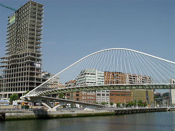Zubizuri Bridge Spain also called the Campo Volantin Bridge or Puente del Campo Volantin, is a tied arch footbridge across the Nervion River in Bilbao, Spain. Designed by architect Santiago Calatrava, the bridge links the Campo Volantin right bank and Uribitarte left bank of the river.